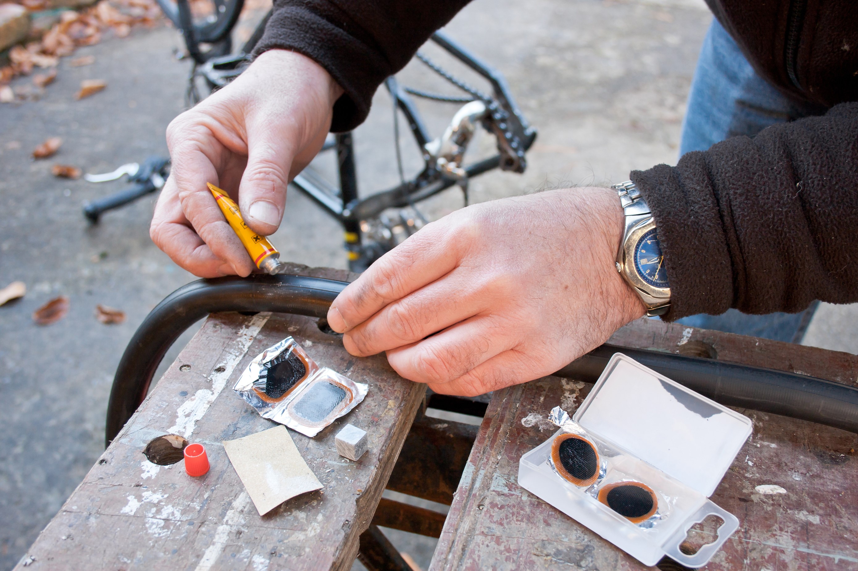 A man repairing his bike.
